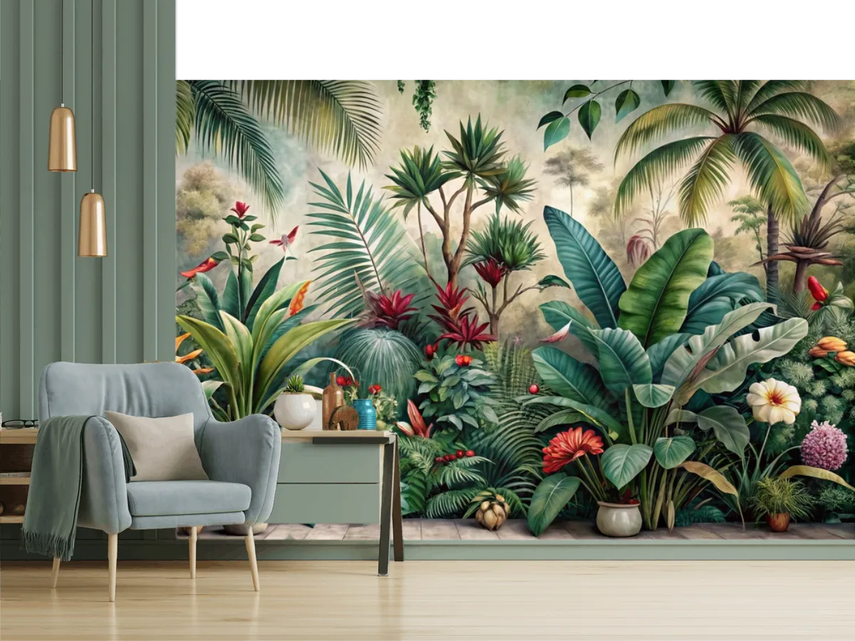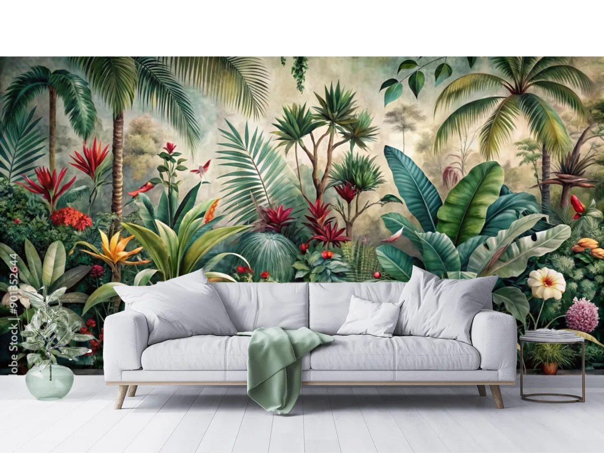 Transforma tu sala con el fotomural Jungle Paradise, un mural de pared exótico lleno de color y vida. ¡Fácil instalación y materiales premium, pide el tuyo hoy!