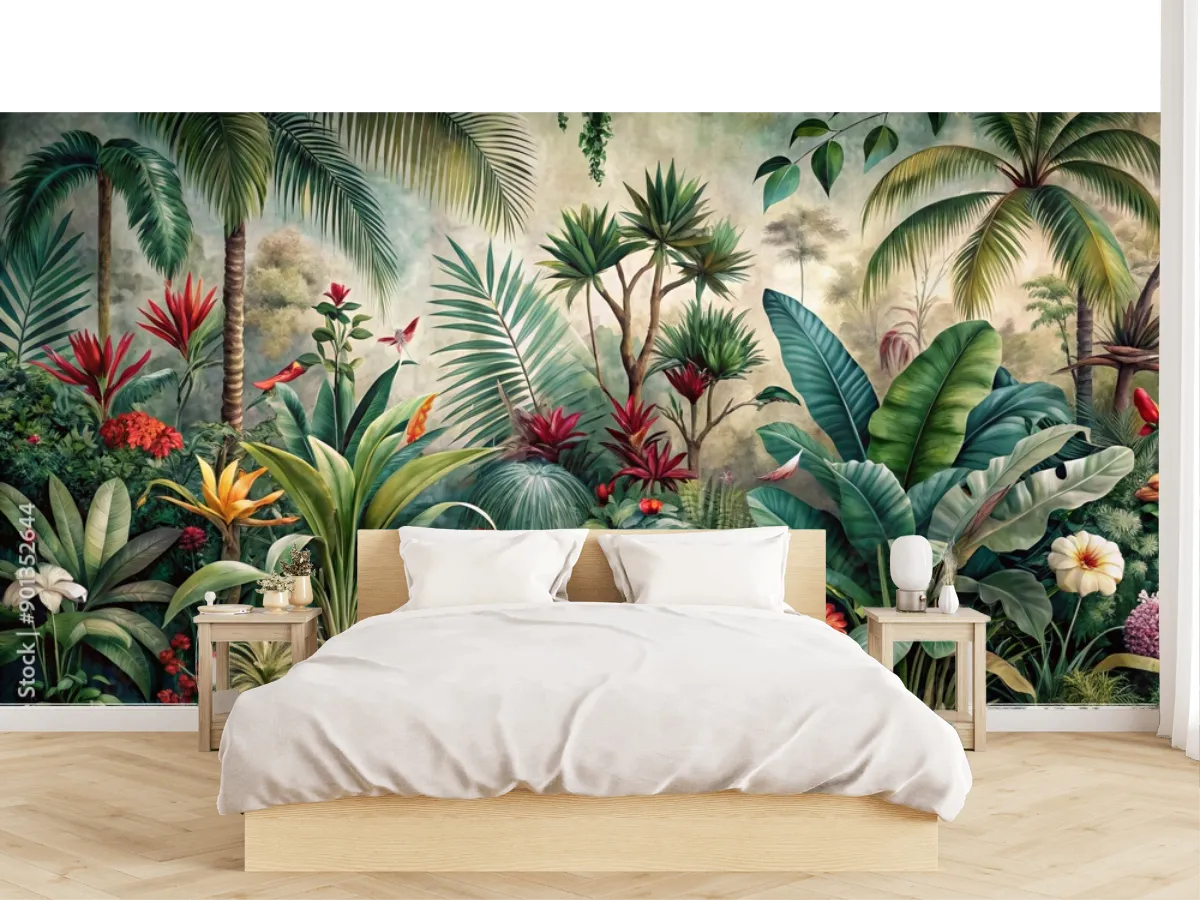 El fotomural Jungle Paradise transforma cualquier estancia: ideal en decoración de sala para ambientes vibrantes y acogedores, perfecto para recámaras infantiles, estudios creativos, consultorios, lobbies de hoteles o restaurantes con temática tropical. Combina con muebles de ratán, maderas claras, metales dorados o textiles en colores neutros o verdes intensos para lograr un estilo boho, urban jungle o tropical chic según tu preferencia.