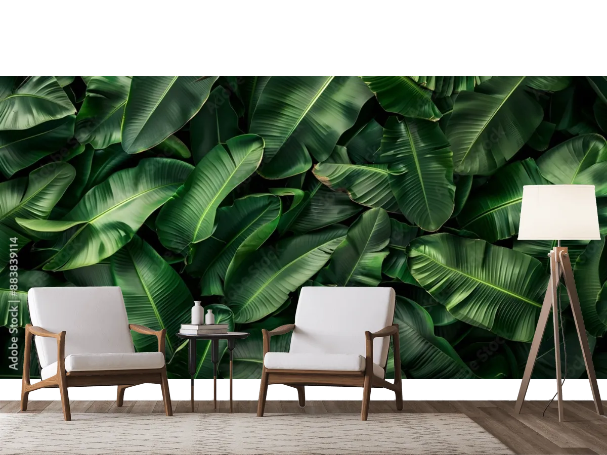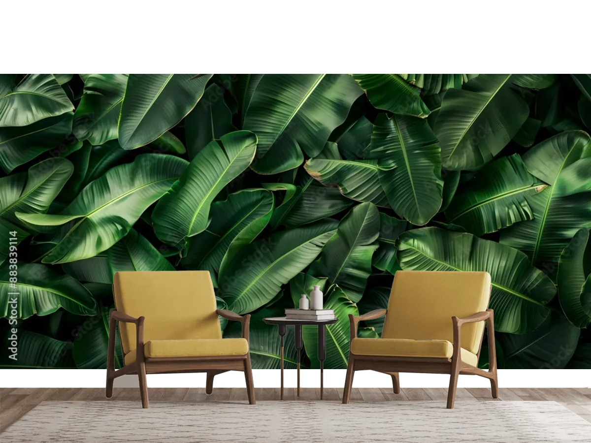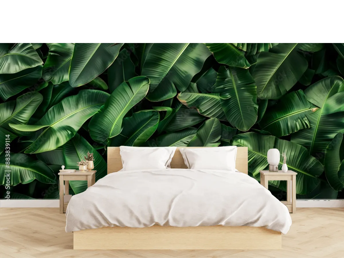 Transforma tu sala o recámara con el fotomural de hojas tropicales, una propuesta vibrante y elegante. Atrévete a crear el ambiente natural de tus sueños.