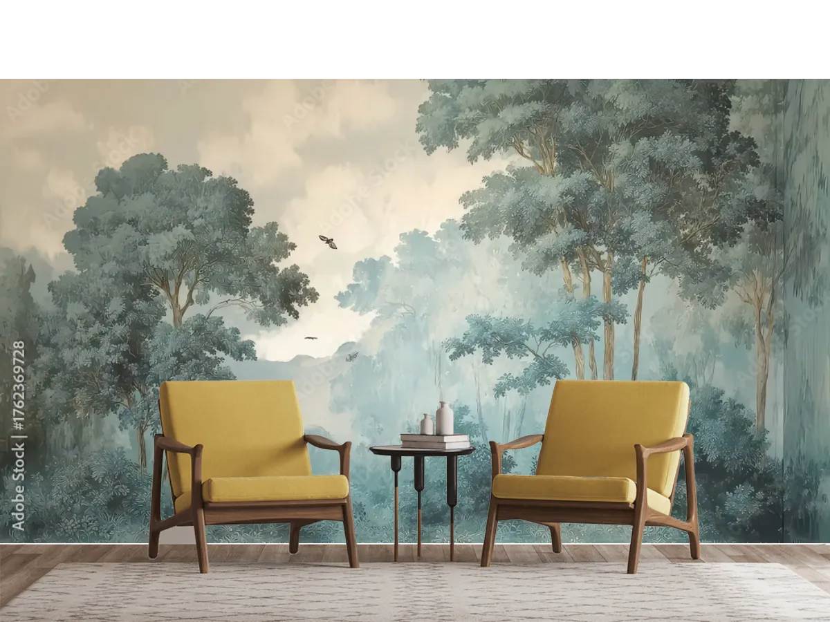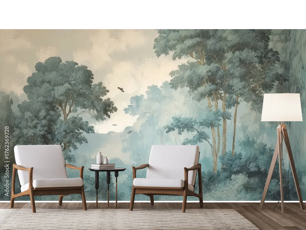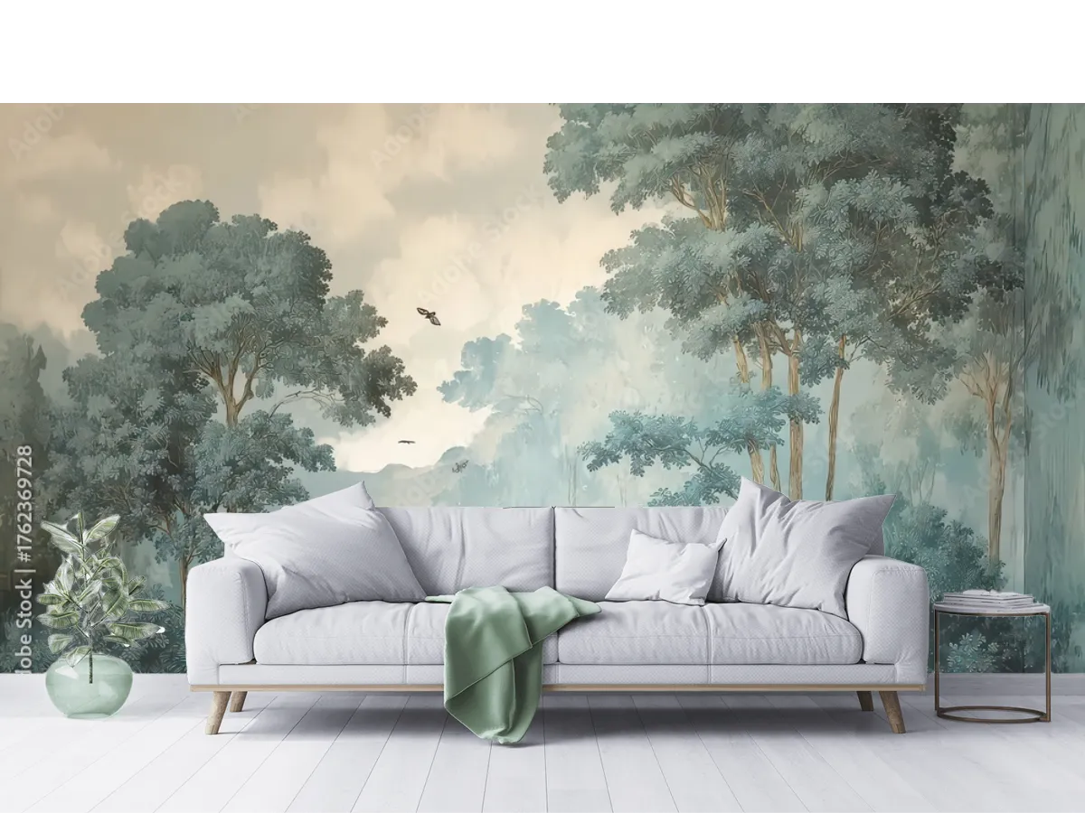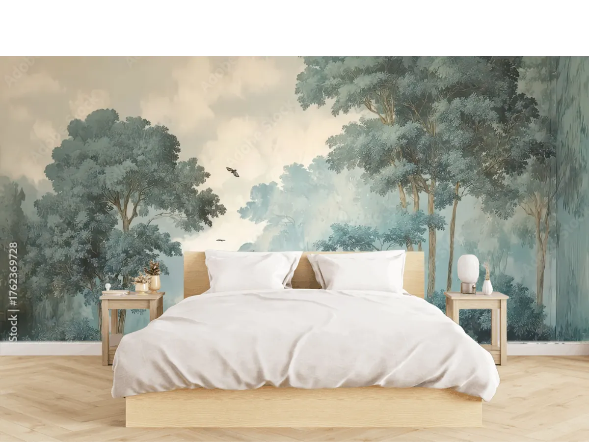 El mural Bosque Místico Azul crea un ambiente relajante y sofisticado en tu sala. ¡Renueva tu espacio con arte de alta calidad y fácil instalación!