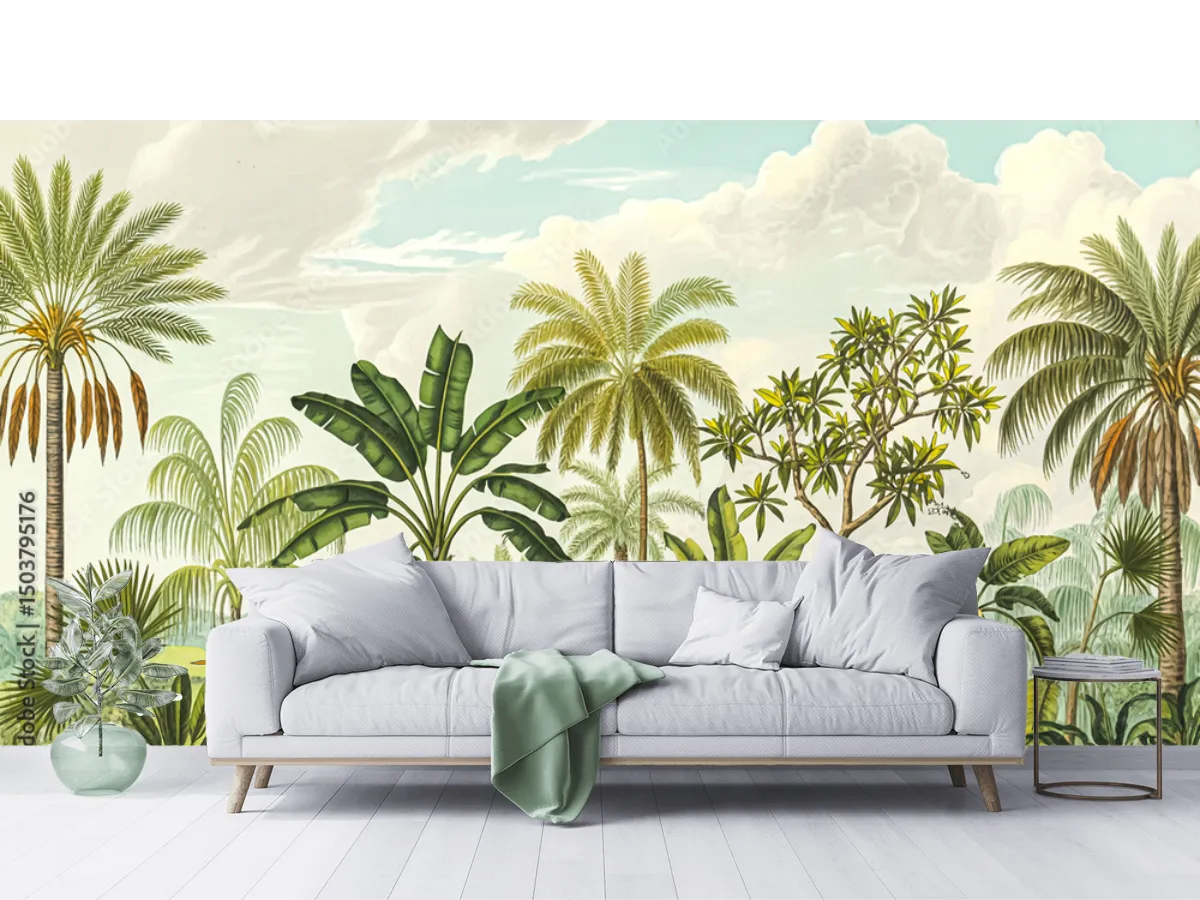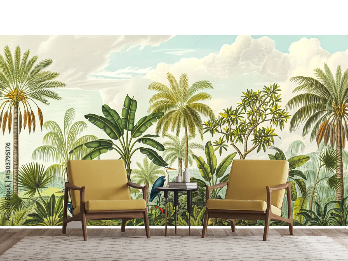 El fotomural Tropical Oasis es la tendencia más buscada en decoración de sala y mural de pared para quienes desean transformar espacios comunes en auténticos oasis de naturaleza y frescura. Este mural de temática tropical recrea palmas, plantas exóticas y aves entre vegetación, ideal para dar vida y un aire relajante a cualquier ambiente de tu hogar u oficina. Ya sea en vinil arquitectónico o papel tapiz decorativo, este mural se adapta a tu estilo y te permite crear una experiencia visual única que inspira y sorprende desde el primer momento.