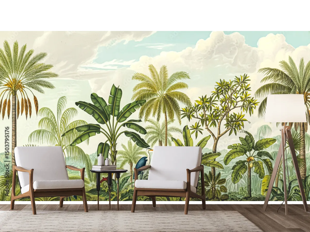 El fotomural Tropical Oasis es ideal para la decoración de salas, comedores, recámaras principales o cuartos de niños, dándoles una atmósfera relajante como si estuvieras en un paraíso tropical. Lleva el verde vibrante y la sensación de selva a áreas de trabajo como home office, consultorios, cafeterías o estudios creativos. Su diseño atemporal encaja perfecto en estilos tropical, boho-chic, moderno naturalista y minimalista. Recomendamos combinarlo con muebles de madera clara, textiles suaves y plantas naturales para potenciar el efecto de frescura y armonía.