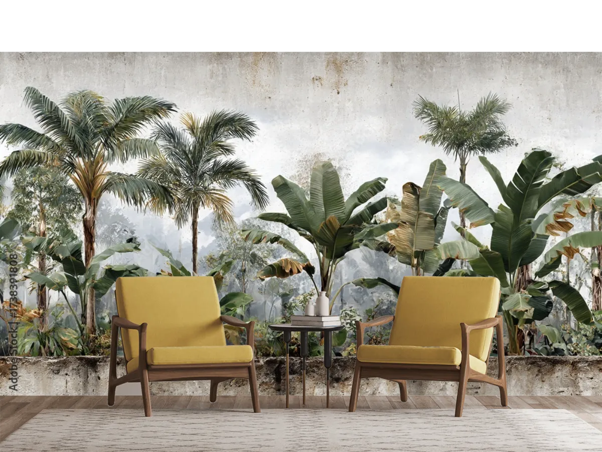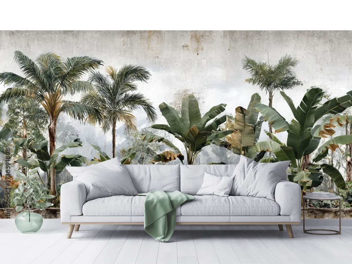 Mural Superficies RugosasInstala el mural Tropical Palmaría y dale vida a tu sala con un ambiente relajante y elegante. Elige entre vinil arquitectónico o tapiz decorativo y renueva tu espacio hoy.