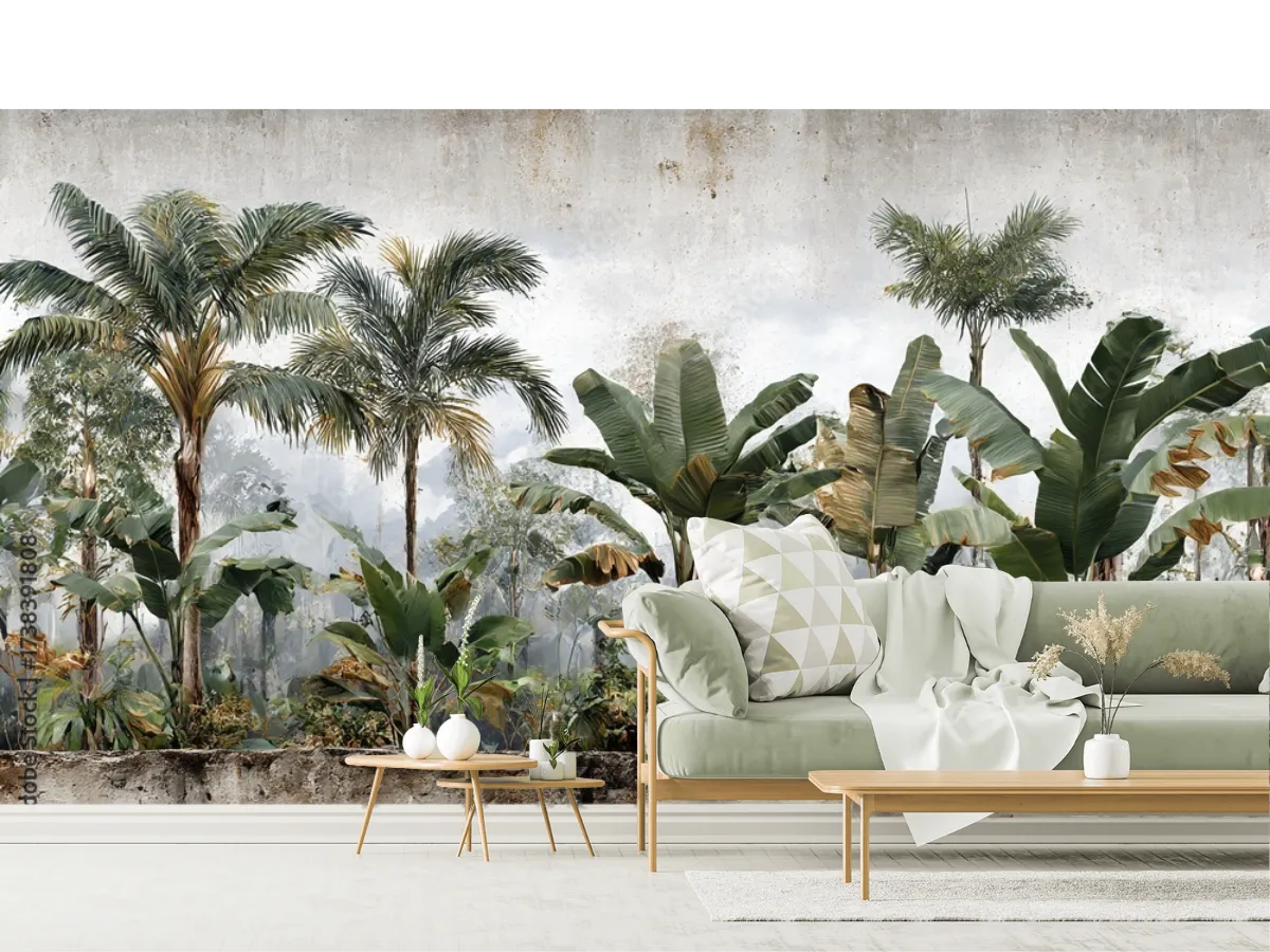Instala el mural Tropical Palmaría y dale vida a tu sala con un ambiente relajante y elegante. Elige entre vinil arquitectónico o tapiz decorativo y renueva tu espacio hoy.